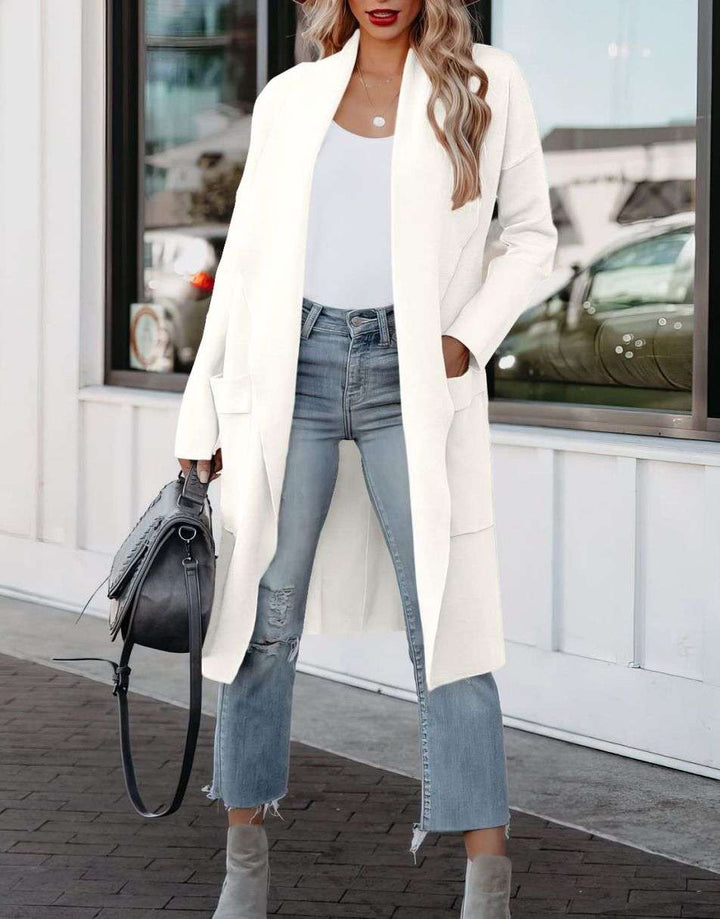 • Features - draped open front,pockets,long sleeve,thigh length cardigan,knitted,relaxed fit.