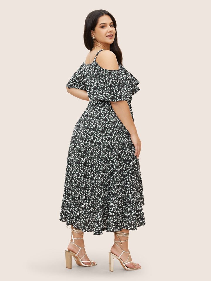 Ditsy Floral Pocket Wrap Cold Shoulder Ruffle Dress